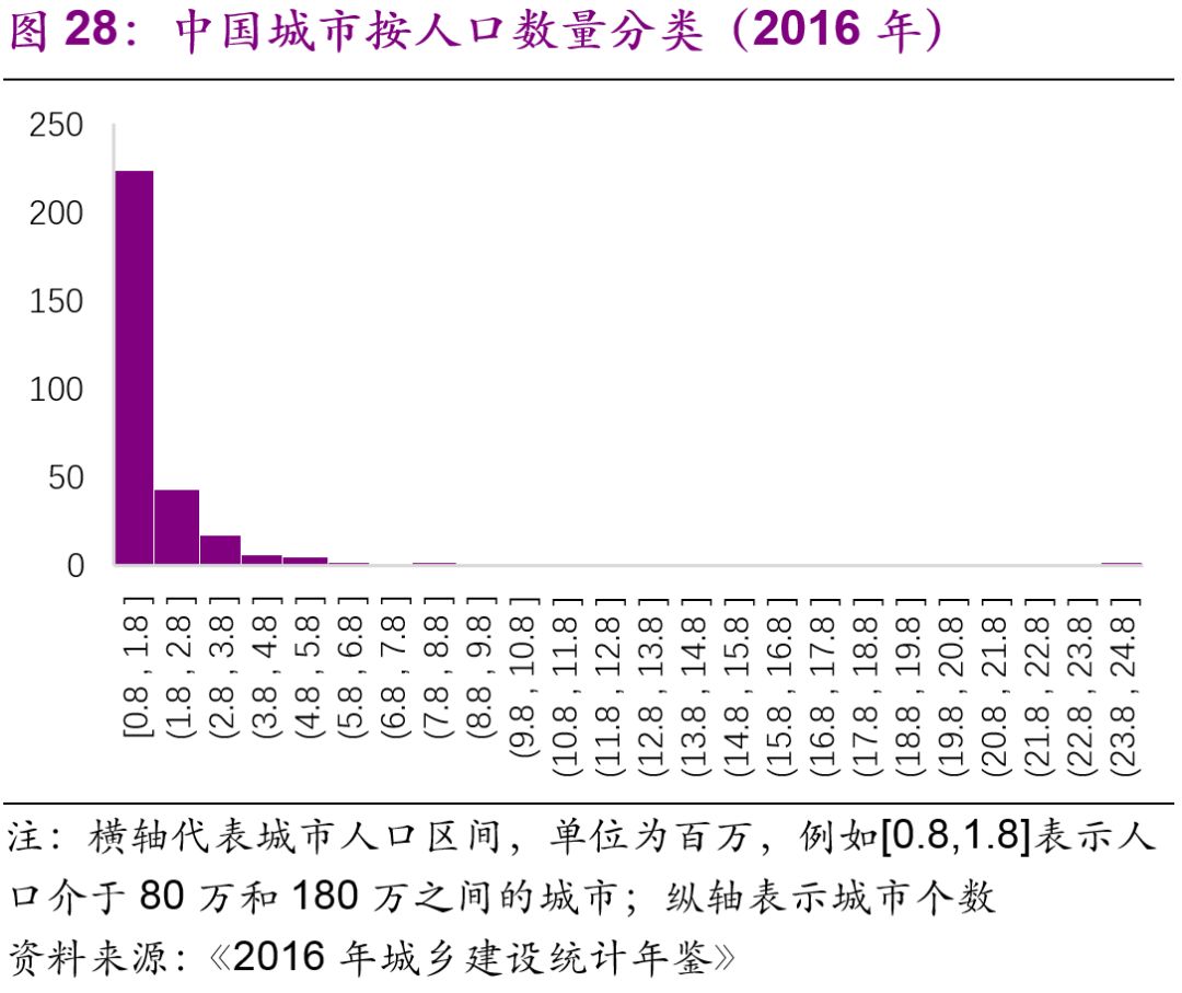 擬建地鐵、輕軌線路初期客運(yùn)強(qiáng)度分別不低于每日每公里0.7萬(wàn)人次、0.4萬(wàn)人次,遠(yuǎn)期客流規(guī)模分別達(dá)到單向高峰小時(shí)3萬(wàn)人次以上、1萬(wàn)人次以上。但是同時(shí)也強(qiáng)調(diào)了:“以上申報(bào)條件將根據(jù)經(jīng)濟(jì)社會(huì)發(fā)展情況按程序適時(shí)調(diào)整?!?016年,中國(guó)城市中市區(qū)常住人口在150萬(wàn)以上的城市共有111個(gè),對(duì)比目前已經(jīng)開(kāi)通軌道交通的城市數(shù)量(34個(gè)),仍有一定的發(fā)展空間。而從國(guó)際上看,建設(shè)軌道交通的城市人口的起點(diǎn)[19]大約為100萬(wàn)(圖27),如果長(zhǎng)期內(nèi)中國(guó)將建設(shè)軌道交通的人口標(biāo)準(zhǔn)下調(diào)至100萬(wàn),那么將有225個(gè)城市符合標(biāo)準(zhǔn)(圖28)。