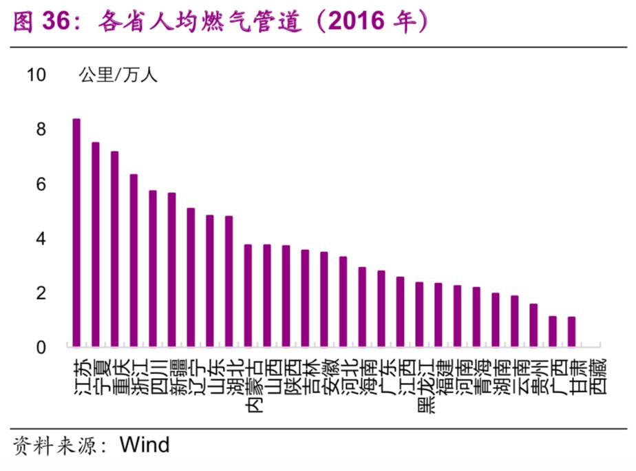 能源基礎(chǔ)設(shè)施方面,東部地區(qū)普遍高于中西部地區(qū)。2016年,燃?xì)夤艿烂芏扰琶叭氖墙K(0.65公里/平方公里)、浙江(0.35公里/平方公里)、山東(0.31公里/平方公里)(圖35);人均燃?xì)夤艿繹22]排名前三的也是浙江(8.4公里/萬(wàn)人)、寧夏(7.5公里/萬(wàn)人)、重慶(7.2公里/萬(wàn)人)(圖36)。