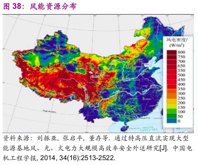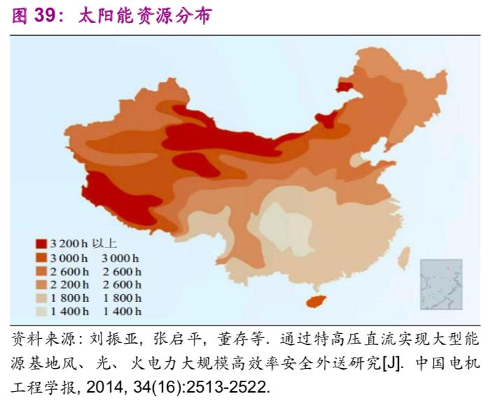 中國(guó)能源資源在地區(qū)之間的不平衡分布帶來(lái)了跨地區(qū)之間的能源輸送需求,例如“西電東送”“西氣東輸”。以水力資源為例,中國(guó)西部12個(gè)省的水力資源約占全國(guó)總量的81.46%,特別是西南地區(qū)的云、貴、川、渝、藏5個(gè)省占全國(guó)總量的66.70%。風(fēng)能、太陽(yáng)能同樣呈現(xiàn)西部多于東部的現(xiàn)象(圖38、39)。