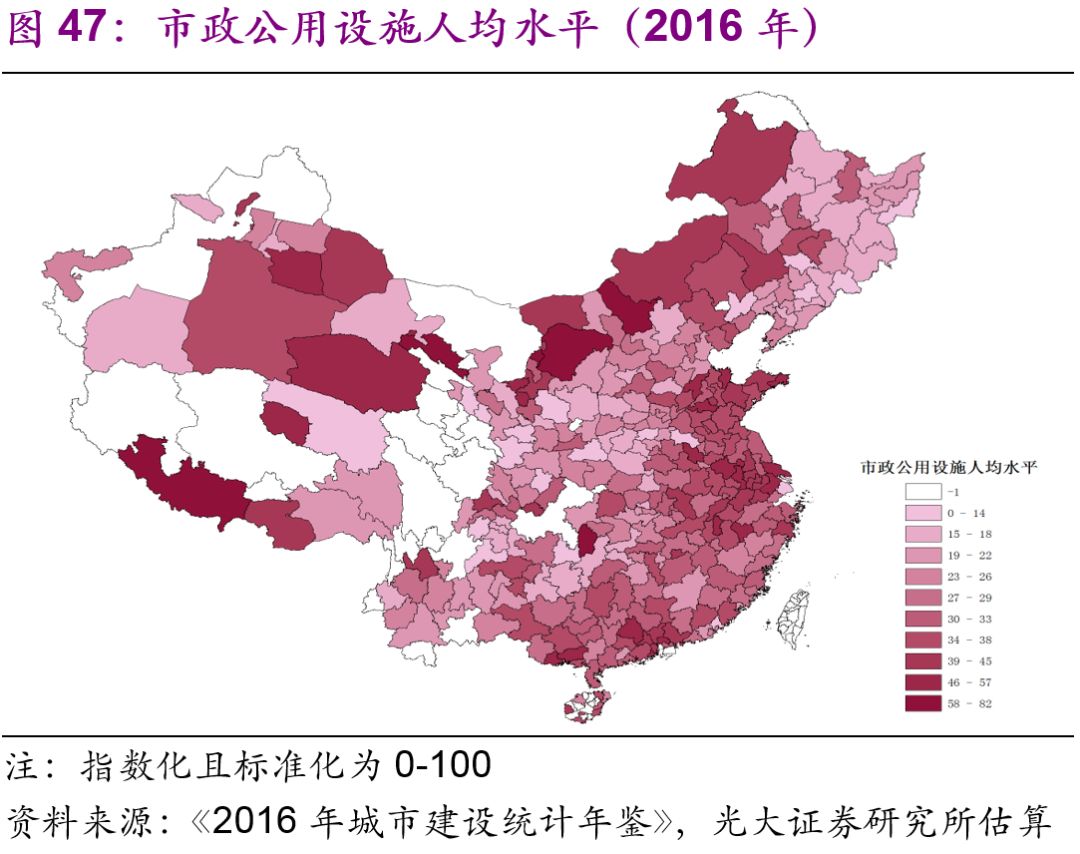 東部和部分西部城市的市政公用設(shè)施水平較高。為了綜合分析各個(gè)城市的市政公用設(shè)施水平,我們使用主成份分析法,選取人均日生活用水量、人均道路面積、人均公園綠地面積,對(duì)2016年中國(guó)各城市得出了綜合的城市市政公用設(shè)施的總量[27]、密度(圖45-46)和人均水平(圖47-48)進(jìn)行了比較。無(wú)論從總量、密度還是人均水平上來(lái)看,東部和部分西部城市都比較高,反而是一些中部和東北部城市的城市市政公用設(shè)施水平處于全國(guó)比較落后的狀態(tài)。