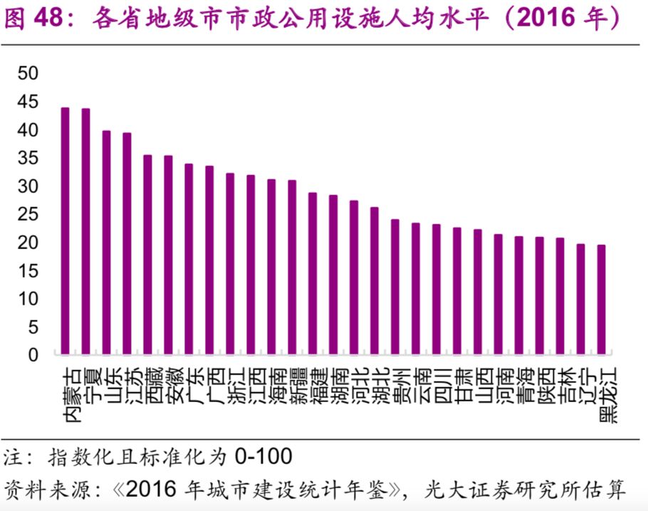 歷史上城市市政公用設(shè)施投資增速與總體基礎(chǔ)設(shè)施建設(shè)投資增速相關(guān)性較高,但近年來(lái)分化加大。而2014年開(kāi)始實(shí)行的規(guī)范地方政府債務(wù)的一系列舉措使得當(dāng)年的城市市政公用設(shè)施投資增速轉(zhuǎn)負(fù),2014、2015年的增速分別為-0.63%、-0.25%,直到2016年才轉(zhuǎn)正。而城市市政公用設(shè)施投資占總體基礎(chǔ)設(shè)施建設(shè)投資的比例則不斷下降,2016年僅為11.5%,較2003年的高點(diǎn)(32.6%)下降了21個(gè)百分點(diǎn)(圖43)。